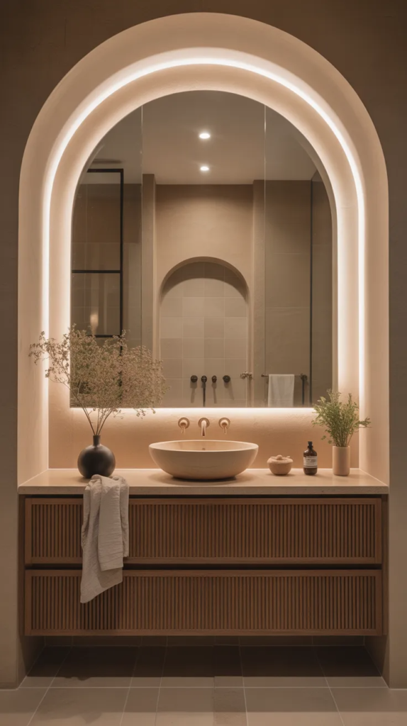 An arched mirror introduces gentle curves that soften the overall design of the bathroom. It breaks away from harsh lines and adds a touch of elegance that feels both modern and timeless. The curved shape naturally draws the eye and creates a focal point.