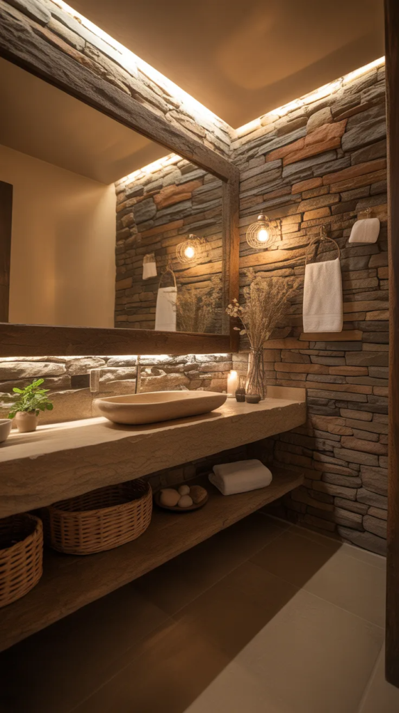 Natural stone walls bring depth and texture that instantly elevate an earthy bathroom. Each stone has its own unique pattern, creating a one-of-a-kind look that feels authentic and grounded. The rough texture contrasts beautifully with smooth surfaces like sinks and mirrors.