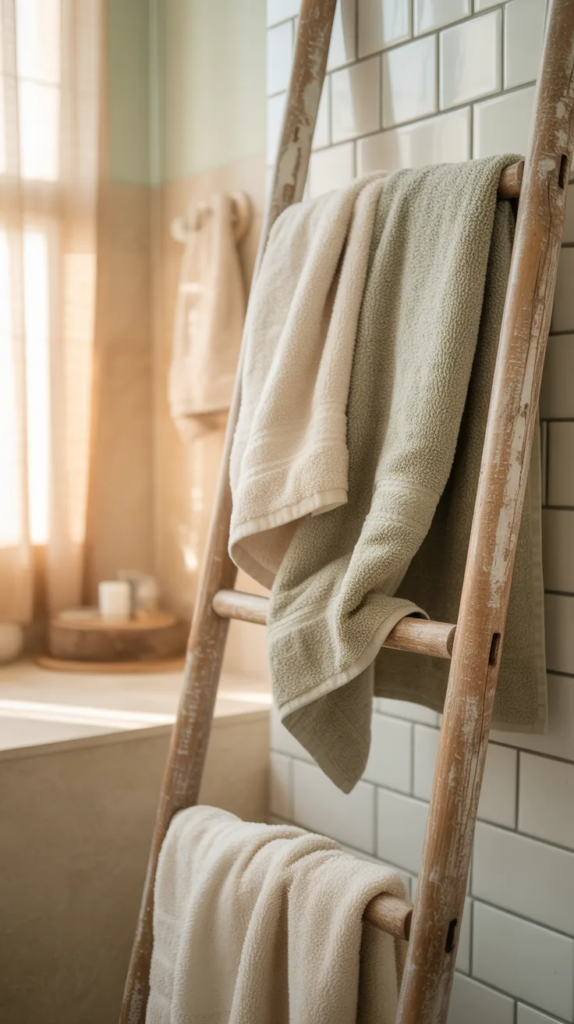A wooden ladder is a simple yet stylish way to store towels while adding rustic charm. Leaned against the wall, it creates a relaxed and casual look that feels warm and inviting. The natural wood texture blends perfectly with earthy decor.