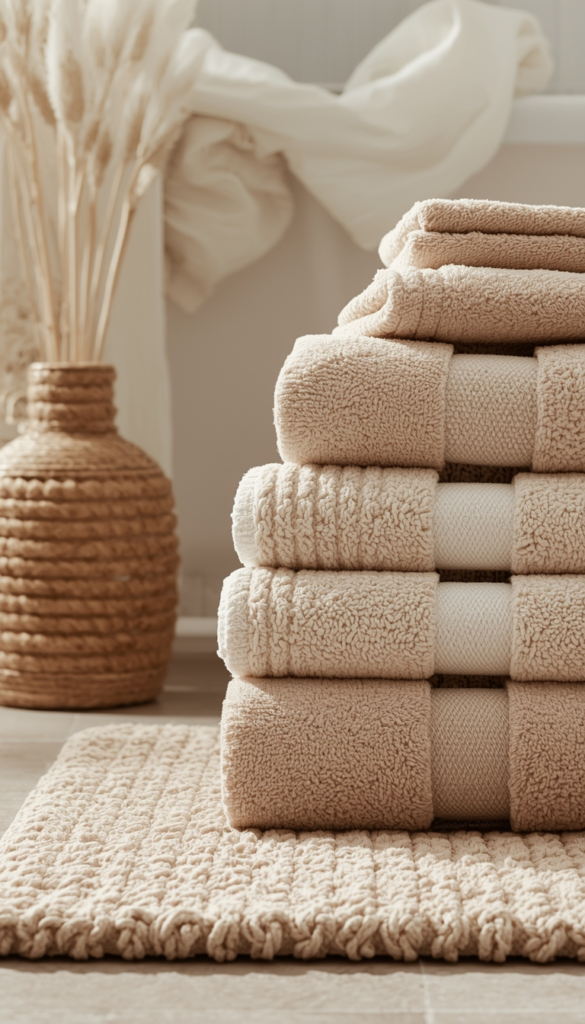 Layering different textiles like towels, rugs, and bath mats adds softness and warmth to your bathroom. Using neutral tones keeps the look cohesive while still adding depth through texture. The result is a space that feels comfortable and welcoming.