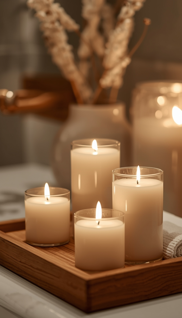 Candles add a warm glow and soothing scent that instantly transforms your bathroom into a spa-like retreat. Earthy fragrances like sandalwood or lavender enhance relaxation and create a calming atmosphere. The soft flicker of candlelight adds a peaceful touch.