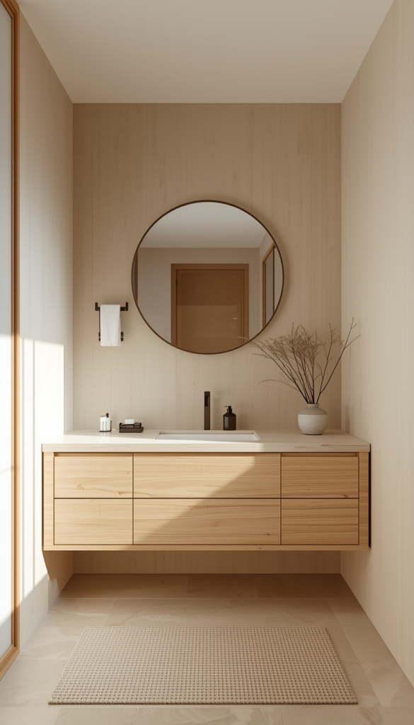 Japandi design blends Japanese simplicity with Scandinavian warmth, making it perfect for an earthy bathroom. Clean lines, soft neutral tones, and natural wood create a space that feels calm, balanced, and uncluttered. Every element is intentional, giving the room a peaceful and mindful atmosphere.