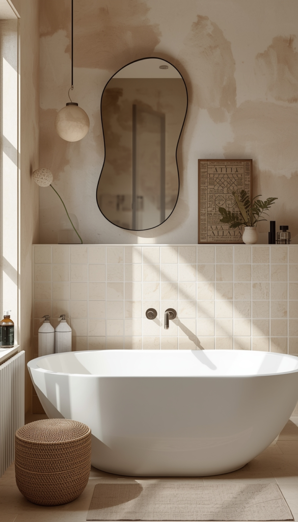 Organic shapes like curved mirrors, rounded sinks, and soft-edged decor bring a gentle, flowing energy into the bathroom. These shapes mimic nature, making the space feel more relaxed and harmonious. They soften the overall look and add a subtle artistic touch.
