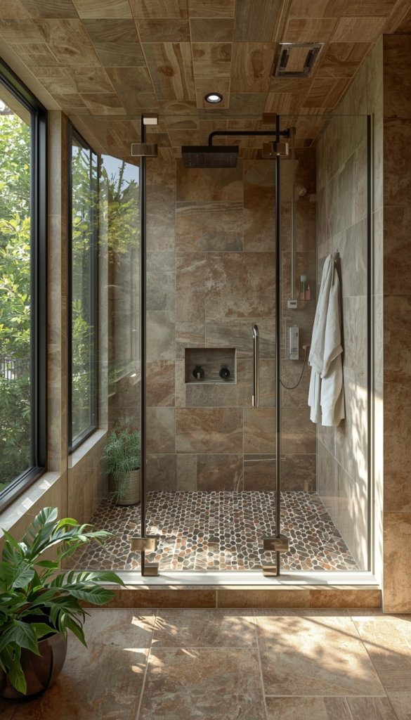 An open shower design removes barriers and creates a seamless flow within the bathroom. With glass panels and natural materials, the space feels larger, brighter, and more connected to nature. It’s both modern and relaxing.
