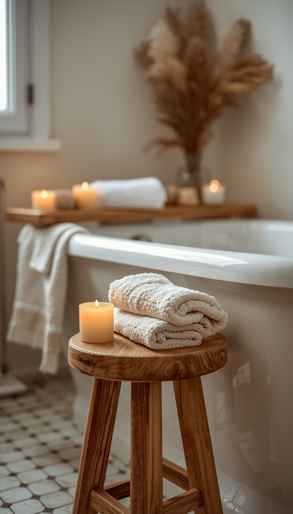 A simple wooden stool adds charm and functionality to an earthy bathroom. It can hold candles, towels, or decor, creating a cozy and styled look. The natural wood tone blends effortlessly with the overall design.
