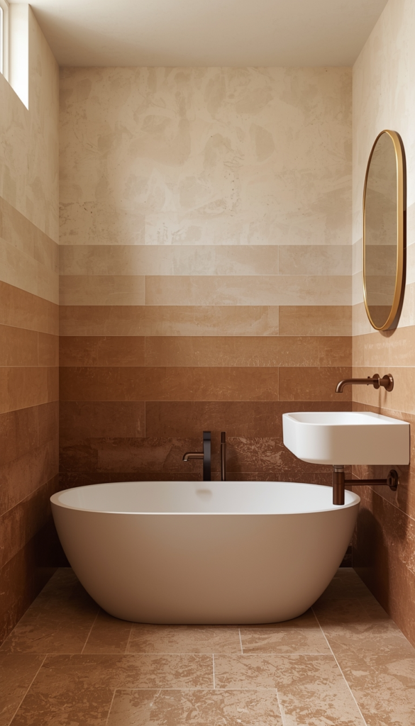 Using a gradient of earthy tones creates a smooth and visually pleasing flow in the bathroom. Starting from light shades and gradually moving to deeper tones adds depth without clutter. It feels natural and balanced.