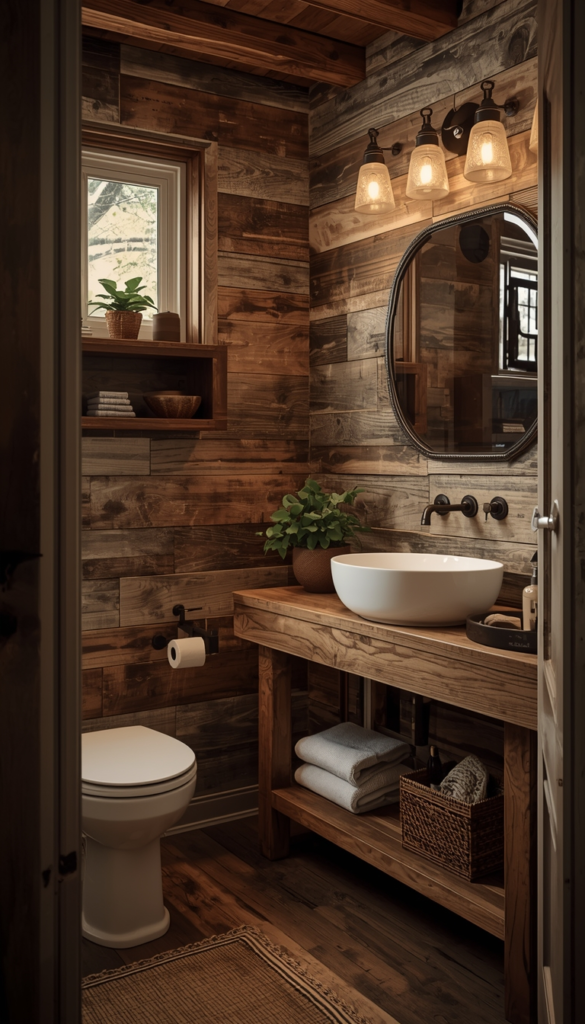 Rustic elements like reclaimed wood and vintage fixtures bring character and warmth into an earthy bathroom. The slightly worn textures create a cozy, lived-in feel that feels authentic and inviting. It’s a style full of personality.