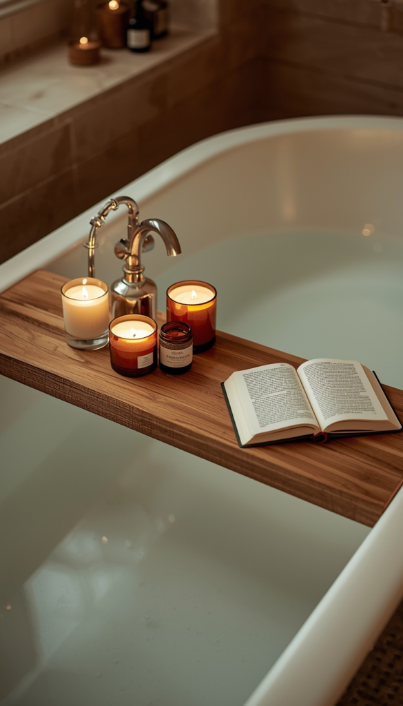 A spa tray placed across your bathtub adds a touch of everyday luxury. It holds candles, books, or bath essentials, turning a simple bath into a relaxing ritual. The wooden texture ties beautifully into earthy decor.