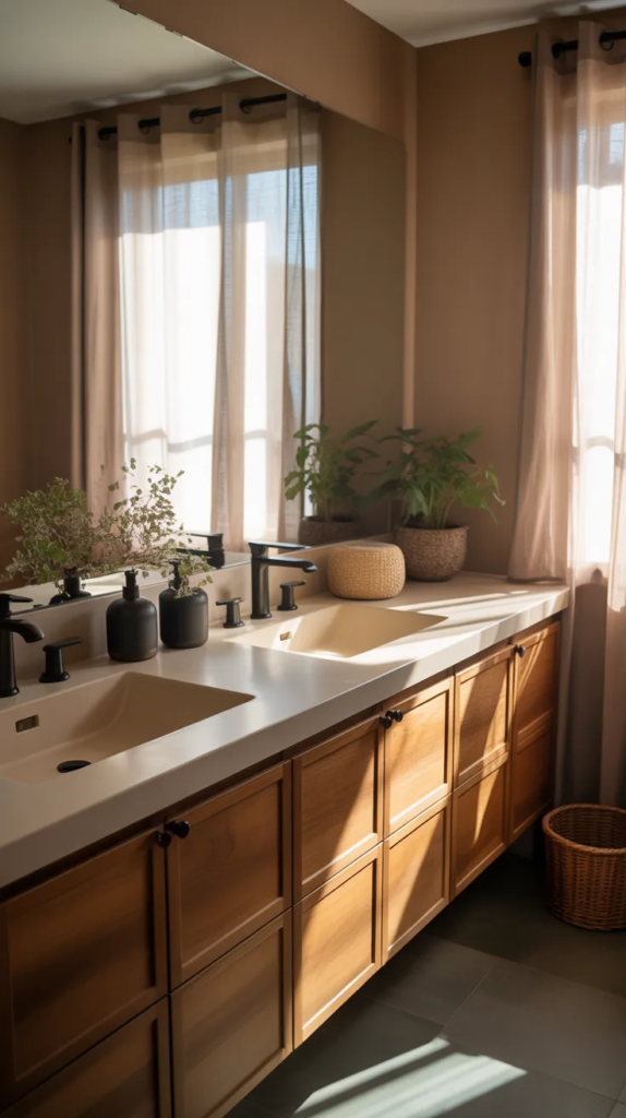 The heart of this earthy bathroom starts with a warm wooden vanity that instantly brings comfort into the space. The rich tones of oak or walnut create a grounded feel, making the bathroom feel less like a utility room and more like a retreat. Paired with neutral countertops and soft lighting, the entire setup feels calming and balanced, perfect for everyday relaxation.