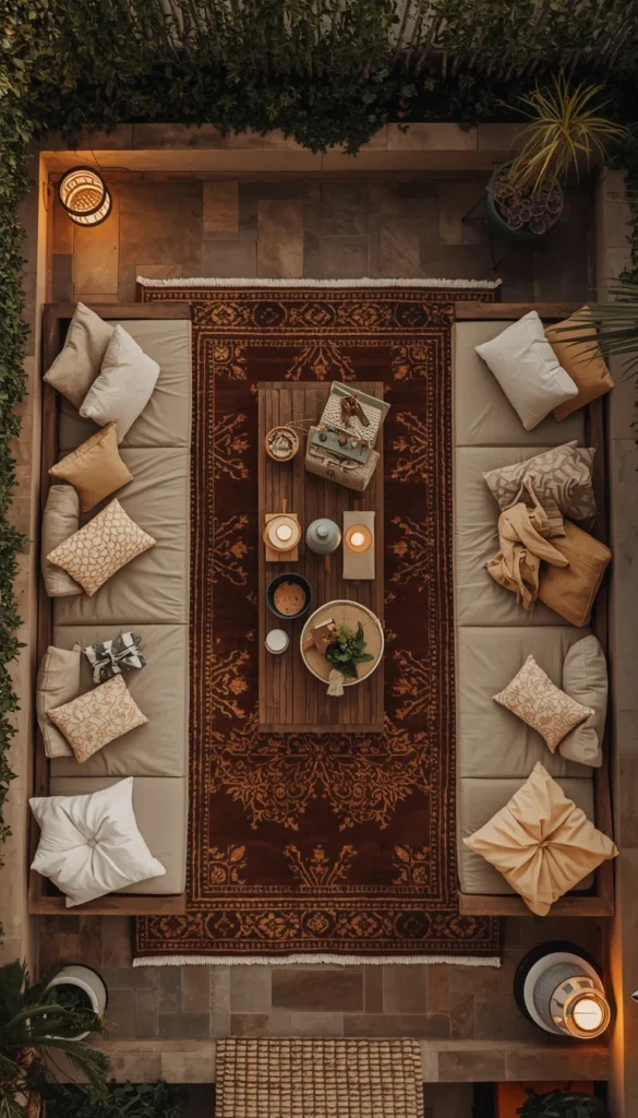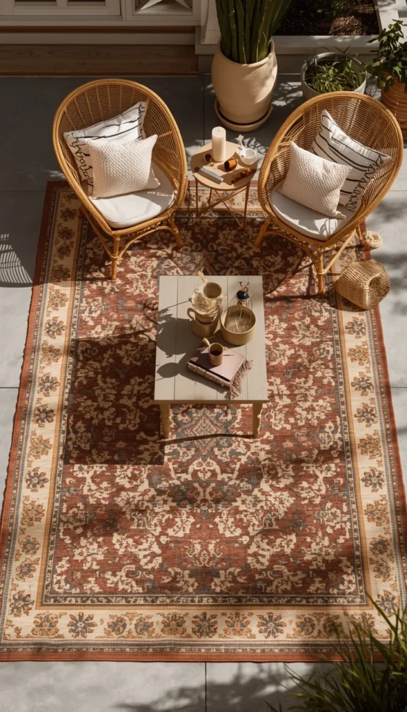 Choose patterns in earthy tones or soft neutrals to add warmth and texture. Arrange your seating around the rug to create a clear focal point. This simple addition brings comfort and visual harmony, making your patio feel complete and thoughtfully designed.