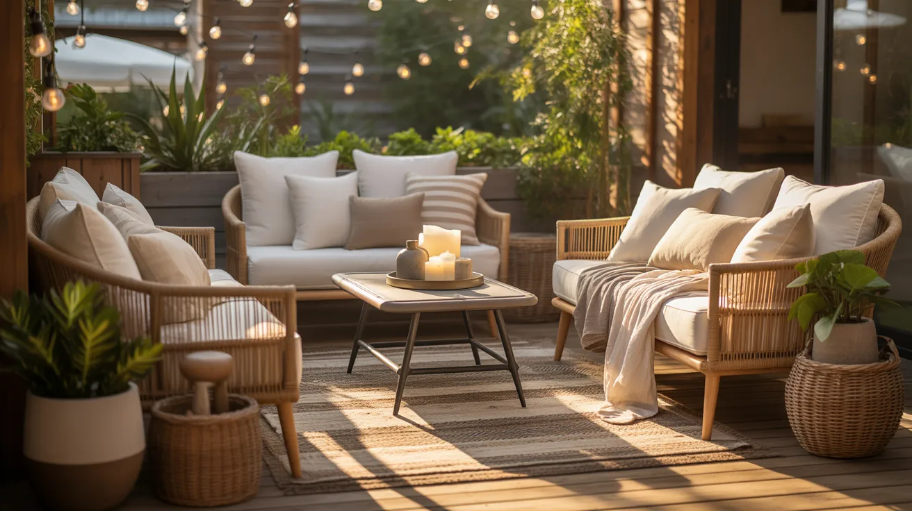 Combine rugs, cushions, and natural materials like wood and linen. Keep the color palette soft and cohesive. The space feels warm, inviting, and beautifully styled—like a true outdoor living room.