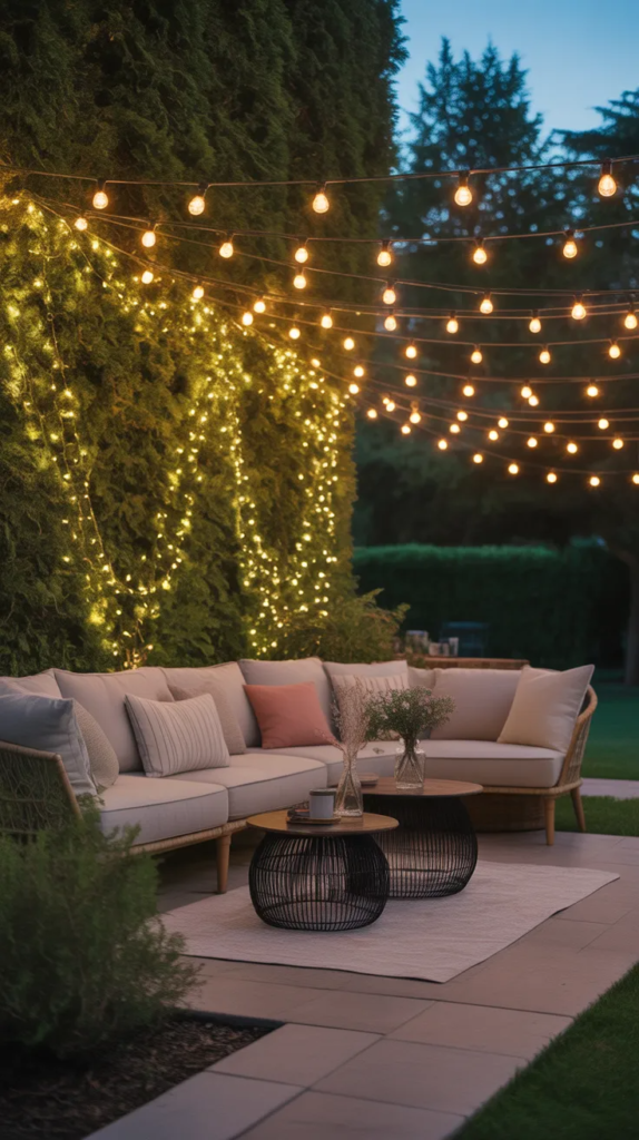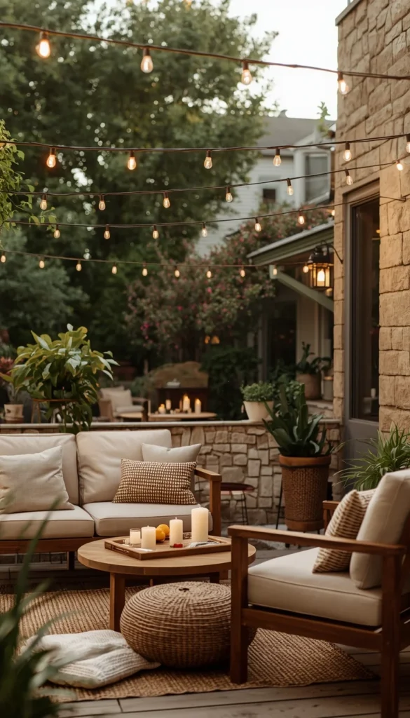 A simple set of string lights can completely transform your patio into a dreamy evening escape. This idea is trending because it creates an instant cozy atmosphere without requiring expensive upgrades. The warm glow adds depth and softness, making even the simplest furniture feel elevated and inviting.