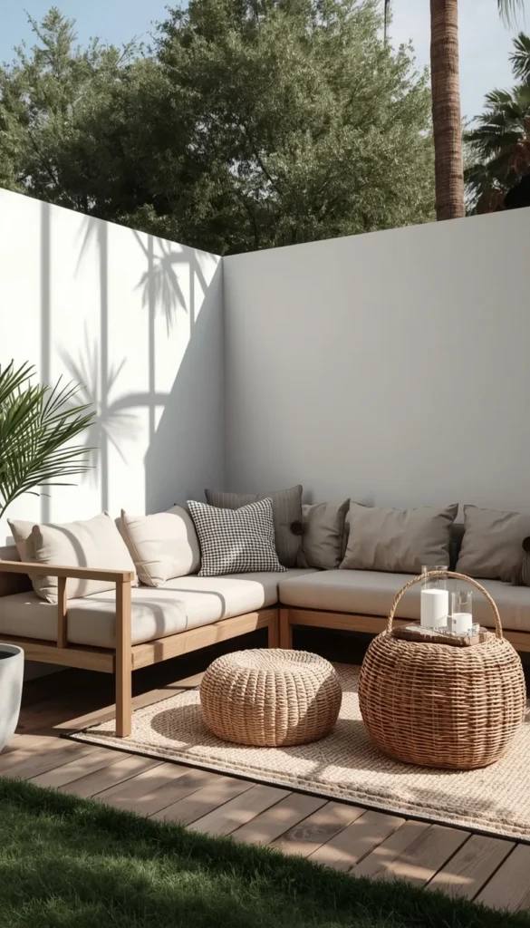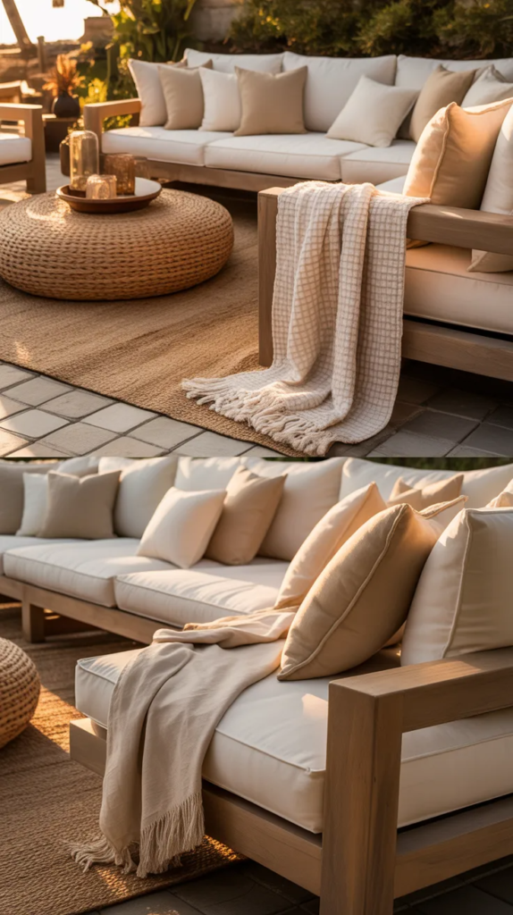 Layer soft cushions and throws in neutral tones to keep the look cohesive. Add a small table or tray for drinks and decor. This setup feels relaxed and welcoming—perfect for creating a laid-back outdoor lounge you’ll love spending time in.