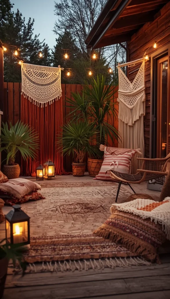 A boho patio is all about mixing textures and creating a relaxed, artistic vibe. This style is trending because it feels personal, cozy, and effortlessly stylish without needing expensive pieces.