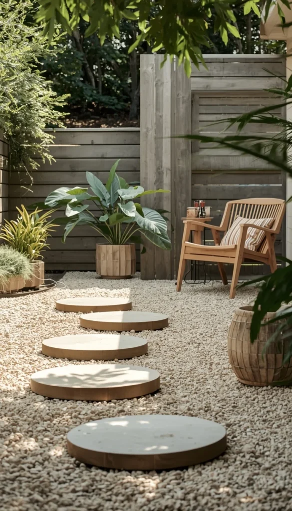 Use irregular stones for a more organic feel and surround them with gravel or grass. Pair with simple furniture to keep the focus on the texture. The result feels balanced, calm, and beautifully grounded.