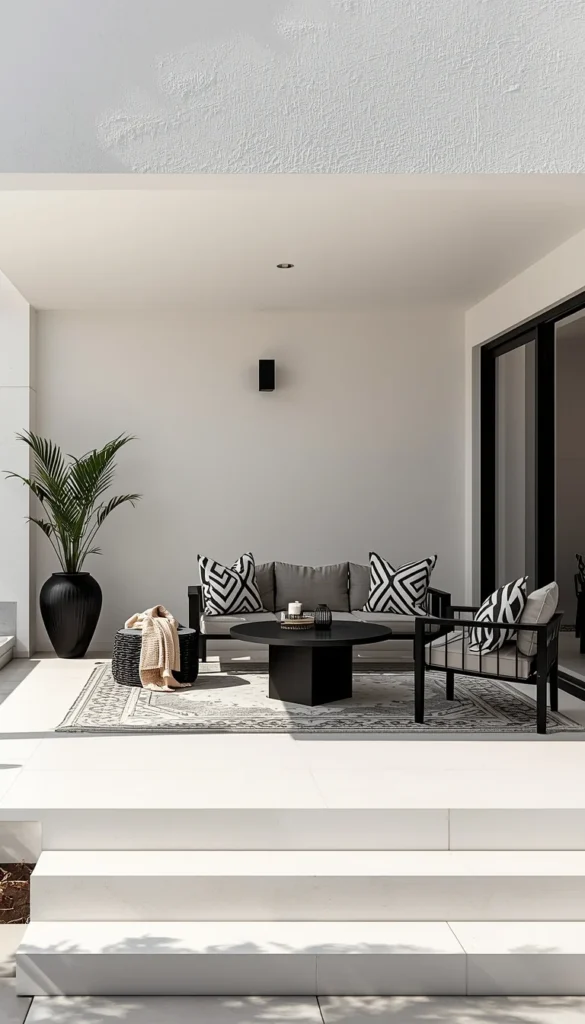 A black and white palette brings a bold yet sophisticated look to your patio. This style is trending because it feels modern, clean, and effortlessly stylish without needing many elements.