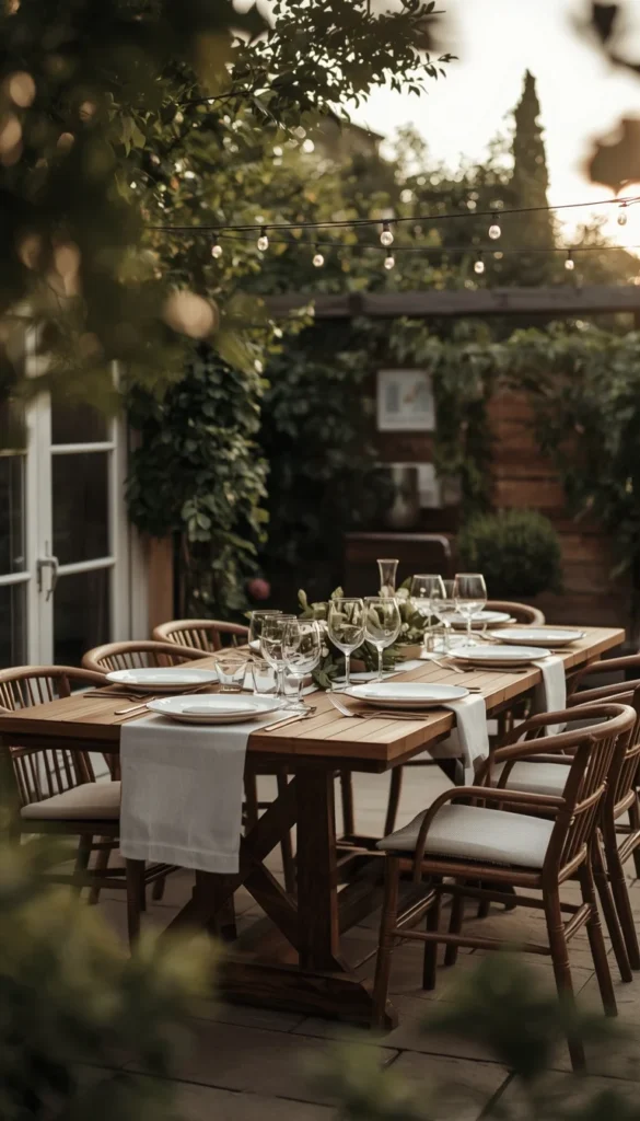 Keep the decor simple with neutral tableware and natural materials. Add soft lighting for evenings. The space feels warm, welcoming, and perfect for gathering with loved ones.