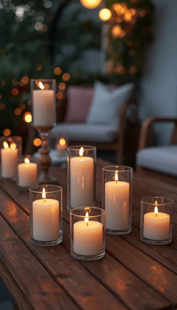 Candles bring a soft, romantic glow that instantly elevates your patio. This idea is trending because it creates a luxurious feel with minimal effort.
