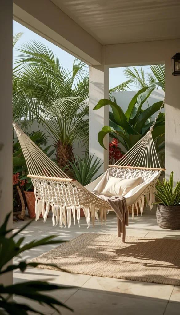 Place it between two posts or trees and add soft cushions for extra comfort. Surround it with plants for a natural vibe. It’s the perfect spot to unwind and enjoy peaceful moments.