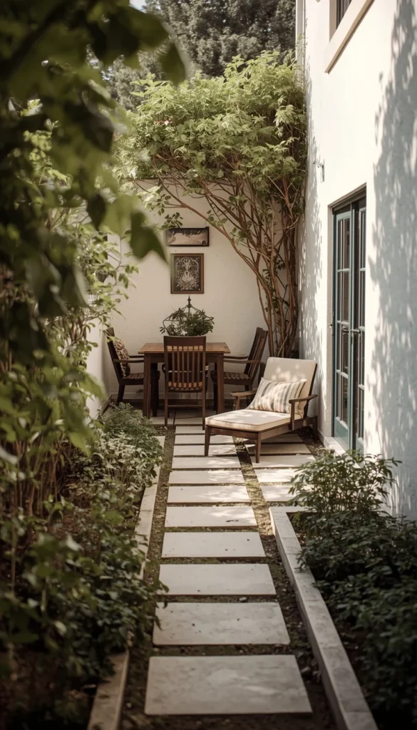 A stone pathway adds structure and movement to your patio design. This idea is trending because it creates a natural, high-end look without needing expensive materials.