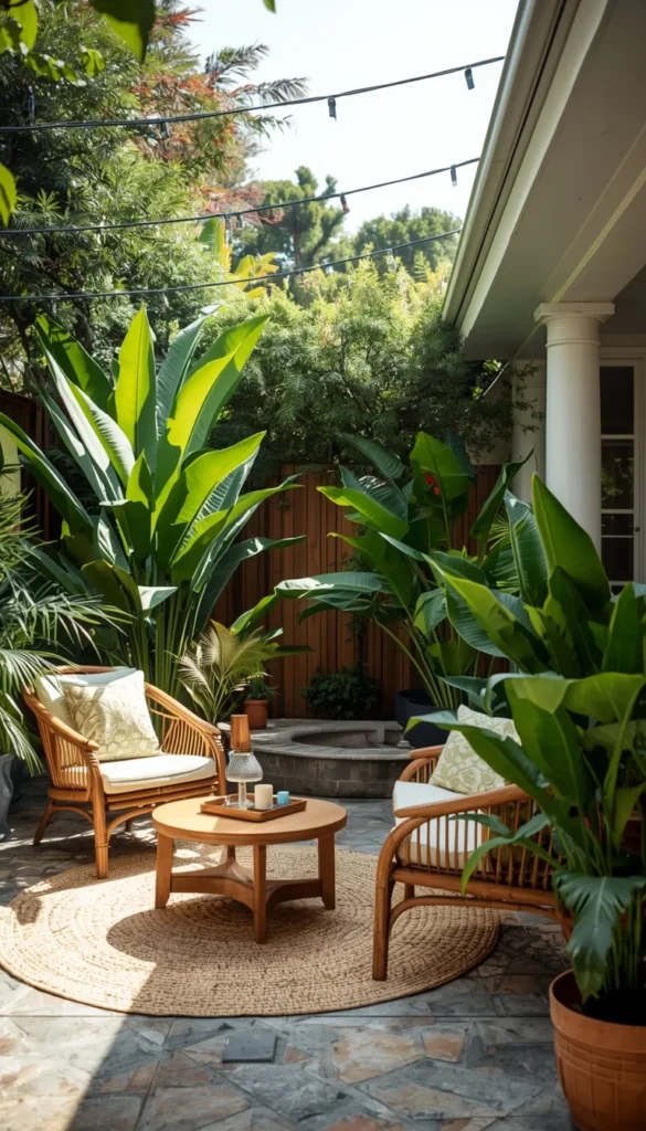 A tropical theme brings energy and life to your patio. This trend is loved for its vibrant, vacation-like feel that transforms any space into a mini getaway.