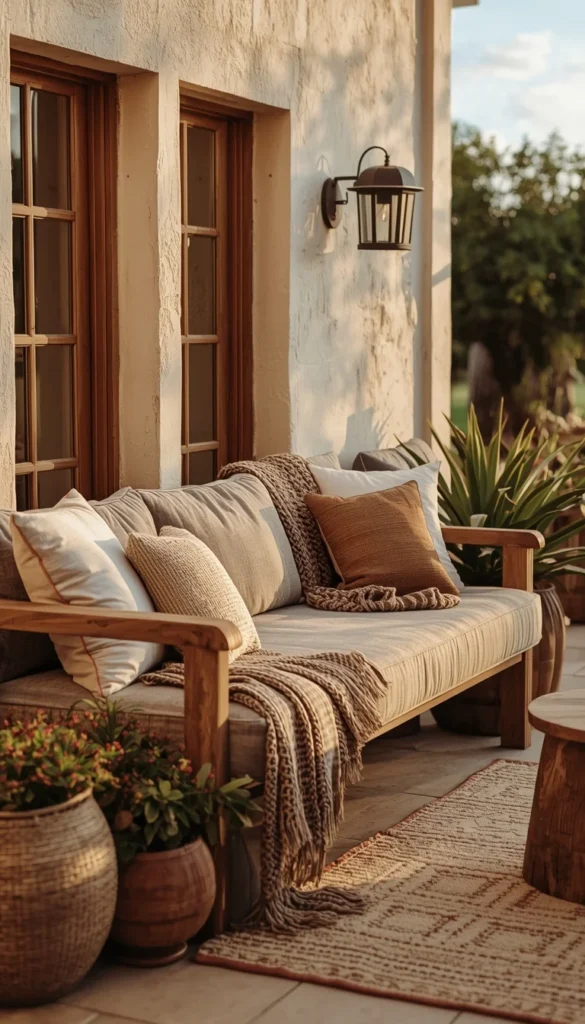 Layering textures is the secret to making any patio look expensive. This idea is trending because it adds depth and richness without needing bold colors or costly items.