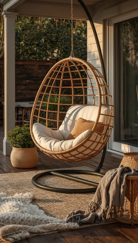 A hanging chair instantly becomes the focal point of any patio, adding both comfort and visual interest. This idea is trending because it blends relaxation with a modern, stylish look that feels high-end yet approachable. The gentle swing creates a calming experience, making your outdoor space feel more like a retreat.